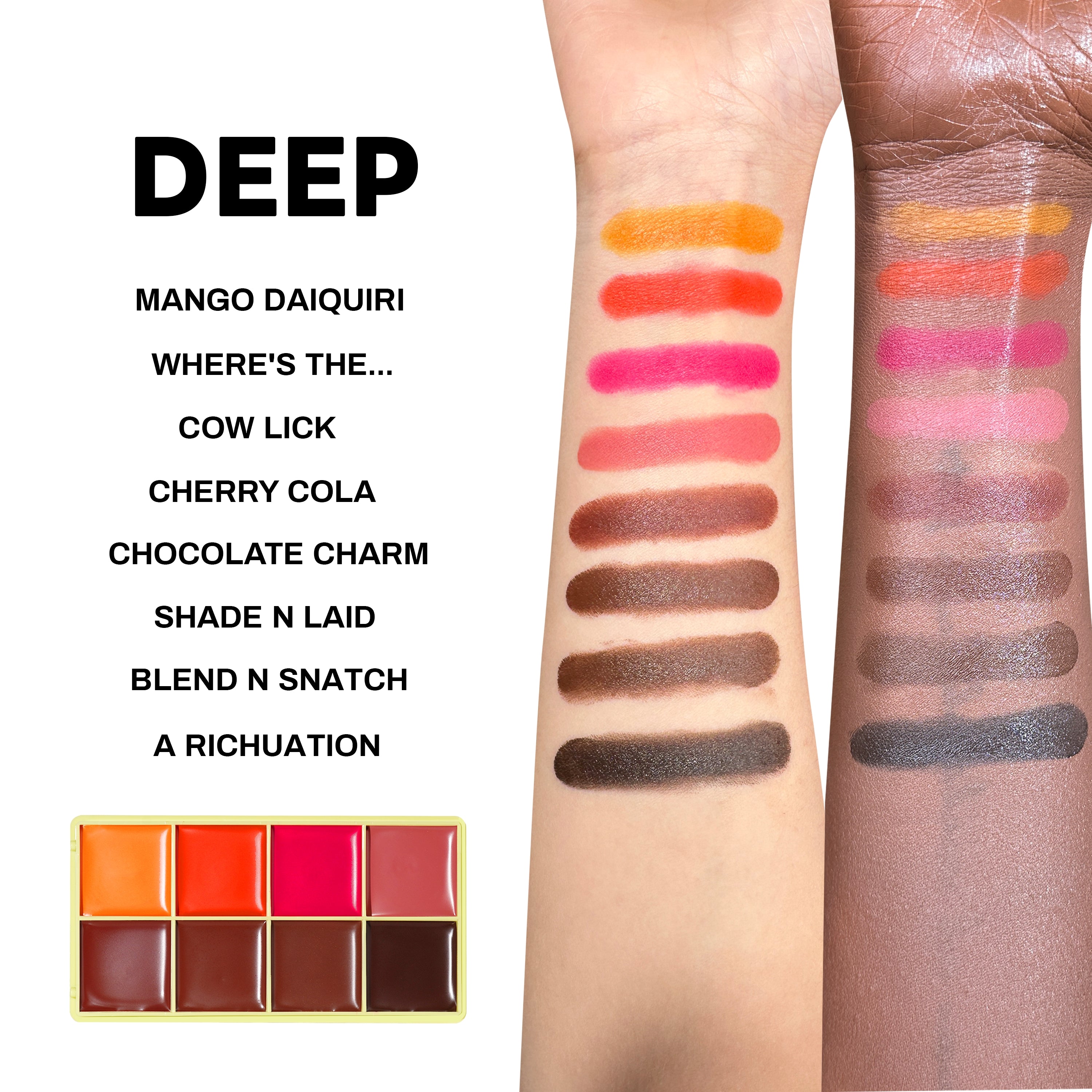 HEXYL LAURATE, SILICA, HYDROGENATED POLYDECENE, PHENYL TRIMETHICONE, ISONONYL ISONONANOATE, SYNTHETIC FLUORPHLOGOPITE, HYDROGENATED POLYISOBUTENE, OZOKERITE, POLYETHYLENE, DIMETHICONE, BISMUTH OXYCHLORIDE, DIMETHICONE CROSSPOLYMER, GLYCERYL BEHENATE/EICOSADIOATE, TOCOPHERYL ACETATE, BHT, [+/-: TITANIUM DIOXIDE (CI 77891), IRON OXIDES (CI 77491) (CI 77492) (CI 77499), RED 21 (CI 45380:3), FD&C YELLOW NO.5 (CI 19140:1), RED 6 (CI 15850), ULTRAMARINES (CI 77007), YELLOW 10 (CI 47005:1)]. HEXYL LAURATE, SILICA, HYDROGENATED POLYDECENE, PHENYL TRIMETHICONE, ISONONYL ISONONANOATE, SYNTHETIC FLUORPHLOGOPITE, HYDROGENATED POLYISOBUTENE, OZOKERITE, POLYETHYLENE, DIMETHICONE, BISMUTH OXYCHLORIDE, DIMETHICONE CROSSPOLYMER, GLYCERYL BEHENATE/EICOSADIOATE, TOCOPHERYL ACETATE, BHT, [+/-: TITANIUM DIOXIDE (CI 77891), IRON OXIDES (CI 77491) (CI 77492) (CI 77499), RED 6 (CI 15850), YELLOW 6 (CI 15985:1), RED 21 (CI 45380:3), FD&C YELLOW NO.5 (CI 19140:1), YELLOW 10 (CI 47005:1)]. HEXYL LAURATE, SILICA, HYDROGENATED POLYDECENE, PHENYL TRIMETHICONE, ISONONYL ISONONANOATE, SYNTHETIC FLUORPHLOGOPITE, HYDROGENATED POLYISOBUTENE, OZOKERITE, POLYETHYLENE, DIMETHICONE, BISMUTH OXYCHLORIDE, DIMETHICONE CROSSPOLYMER, GLYCERYL BEHENATE/EICOSADIOATE, TOCOPHERYL ACETATE, BHT, [+/-: TITANIUM DIOXIDE (CI 77891), IRON OXIDES (CI 77491) (CI 77492) (CI 77499), RED 6 (CI 15850), FD&C YELLOW NO.5 (CI 19140:1), RED 21 (CI 45380:3), RED 27 (CI 45410:2), YELLOW 6 (CI 15985:1)]. HEXYL LAURATE, SILICA, HYDROGENATED POLYDECENE, PHENYL TRIMETHICONE, ISONONYL ISONONANOATE, SYNTHETIC FLUORPHLOGOPITE, HYDROGENATED POLYISOBUTENE, OZOKERITE, POLYETHYLENE, DIMETHICONE, BISMUTH OXYCHLORIDE, DIMETHICONE CROSSPOLYMER, GLYCERYL BEHENATE/EICOSADIOATE, TOCOPHERYL ACETATE, BHT, [+/-: TITANIUM DIOXIDE (CI 77891), IRON OXIDES (CI 77491) (CI 77492) (CI 77499), RED 6 (CI 15850), YELLOW 6 (CI 15985:1), FD&C YELLOW NO.5 (CI 19140:1), RED 21 (CI 45380:3), YELLOW 10 (CI 47005:1), RED 27 (CI 45410:2)]. HEXYL LAURATE, SILICA, HYDROGENATED POLYDECENE, PHENYL TRIMETHICONE, ISONONYL ISONONANOATE, SYNTHETIC FLUORPHLOGOPITE, HYDROGENATED POLYISOBUTENE, OZOKERITE, POLYETHYLENE, DIMETHICONE, BISMUTH OXYCHLORIDE, DIMETHICONE CROSSPOLYMER, GLYCERYL BEHENATE/EICOSADIOATE, TOCOPHERYL ACETATE, BHT, [+/-: TITANIUM DIOXIDE (CI 77891), IRON OXIDES (CI 77491) (CI 77492) (CI 77499), RED 6 (CI 15850), YELLOW 6 (CI 15985:1), YELLOW 10 (CI 47005:1), RED 27 (CI 45410:2), RED 21 (CI 45380:3), FD&C YELLOW NO.5 (CI 19140:1)]. HEXYL LAURATE, SILICA, HYDROGENATED POLYDECENE, PHENYL TRIMETHICONE, ISONONYL ISONONANOATE, SYNTHETIC FLUORPHLOGOPITE, HYDROGENATED POLYISOBUTENE, OZOKERITE, POLYETHYLENE, DIMETHICONE, BISMUTH OXYCHLORIDE, DIMETHICONE CROSSPOLYMER, GLYCERYL BEHENATE/EICOSADIOATE, TOCOPHERYL ACETATE, BHT, [+/-: TITANIUM DIOXIDE (CI 77891), IRON OXIDES (CI 77491) (CI 77492) (CI 77499), RED 6 (CI 15850), MANGANESE VIOLET (CI 77742), ULTRAMARINES (CI 77007), RED 27 (CI 45410:2)].
